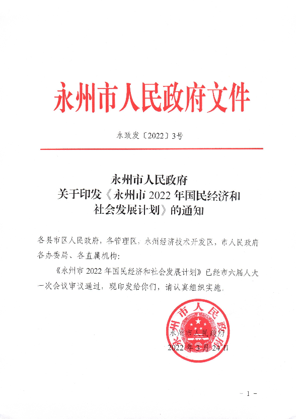 关于印发《永州市2022年国民经济和社会发展计划》的通知
