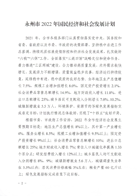 关于印发《永州市2022年国民经济和社会发展计划》的通知