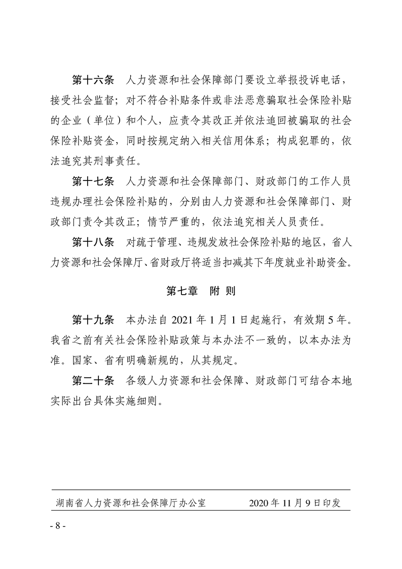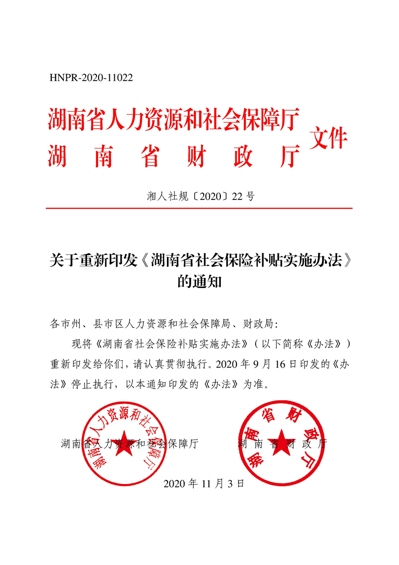 湘人社规[2020]22号关于重新印发《湖南省社会保险补贴实施办法》的通知