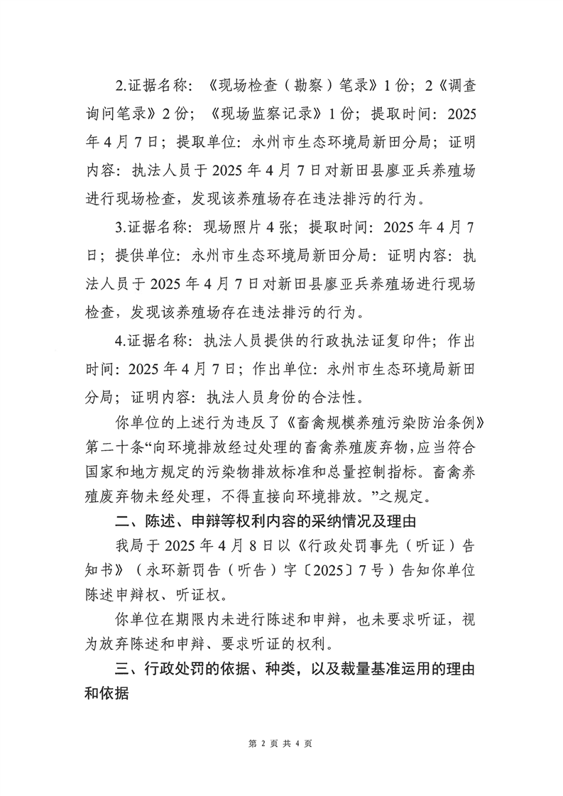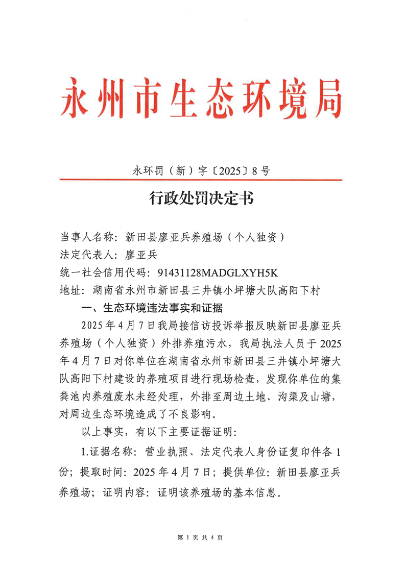 开云真人足球廖亚兵养殖场(个人独资)集粪池内养殖废水未经处理,外排至周边土地、沟渠及山塘行政处罚决定书