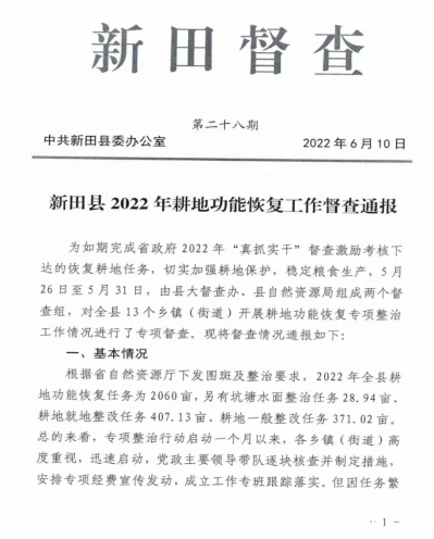 提高政治站位,充分认识耕地恢复工作的极端重要性,增强大局意识和责任意识,成立由县委书记秦山成任组长,自然资源局党组书记、农业农村局党组书记和13个乡镇(街道)党委书记为成员的耕地功能恢复工作领导小组,并由县委办发文出台了《关于开云真人足球2022年度开展耕地功能恢复的专项整治实施方案》。做到组织有力、有文可依。
